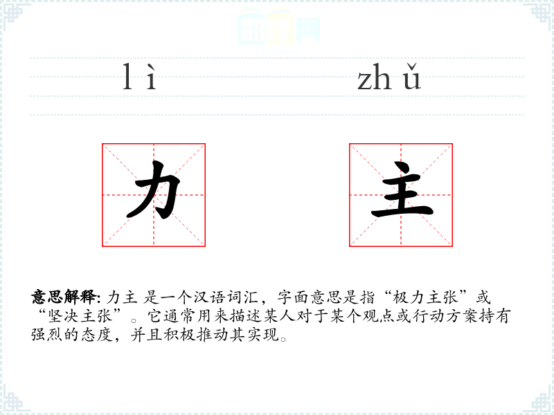 力主 是一个汉语词汇,字面意思是指“极力主张”或“坚决主张”。它通常用来描述某人对于某个观点或行动方案持有强烈的态度,并且积极推动其实现。