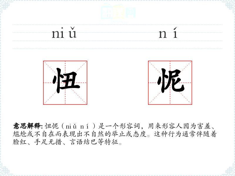 忸怩(niǔ ní)是一个形容词,用来形容人因为害羞、尴尬或不自在而表现出不自然的举止或态度。这种行为通常伴随着脸红、手足无措、言语结巴等特征。