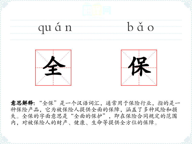 “全保”一词源于汉语,直接反映了其字面意思“全面的保护”。随着保险行业的发展,这个词在专业领域中得到了广泛应用,并逐渐被大众所熟知。