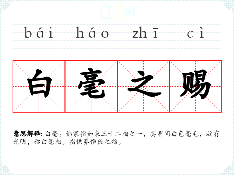 白毫:佛家指如来三十二相之一,其眉间白色毫毛,放有光明,称白毫相。指供养僧徒之物。