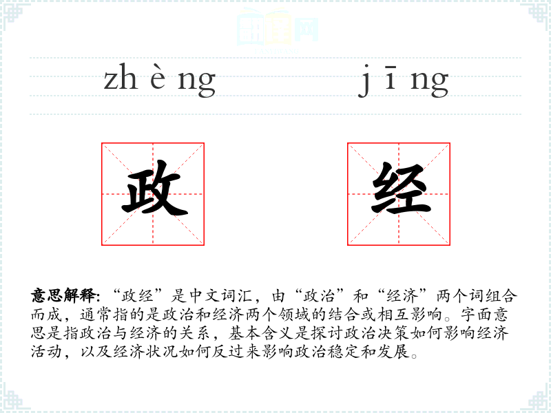 “政经”是中文词汇,由“政治”和“经济”两个词组合而成,通常指的是政治和经济两个领域的结合或相互影响。字面意思是指政治与经济的关系,基本含义是探讨政治决策如何影响经济活动,以及经济状况如何反过来影响政治稳定和发展。