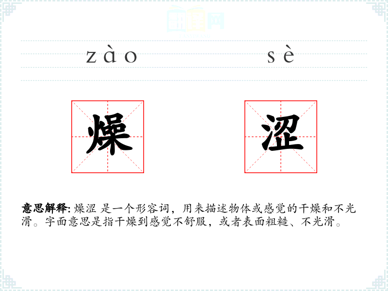 燥涩 是一个形容词,用来描述物体或感觉的干燥和不光滑。字面意思是指干燥到感觉不舒服,或者表面粗糙、不光滑。