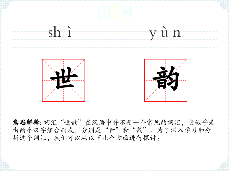 - “世韵”这个词汇虽然不常见,但它提供了一个丰富的想象空间,可以用来描述和赞美特定时代的文化特征。在语言学*和表达中,了解和运用这样的词汇可以增加表达的深度和多样性。