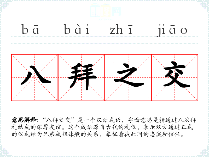 “八拜之交”是一个汉语成语,字面意思是指通过八次拜礼结成的深厚友谊。这个成语源自古代的礼仪,表示双方通过正式的仪式结为兄弟或姐妹般的关系,象征着彼此间的忠诚和信任。