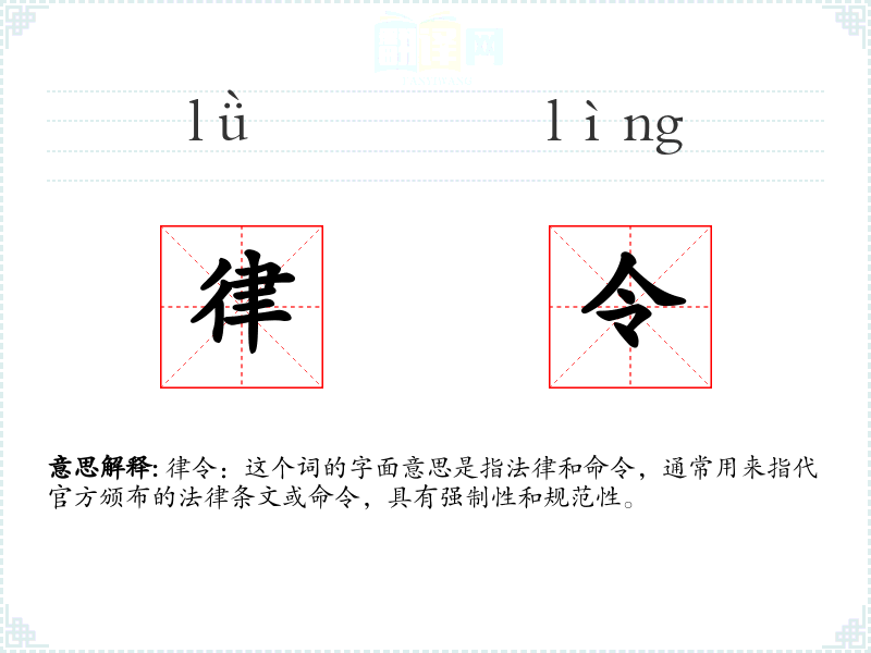 在视觉上,“律令”可能让人联想到古代的法律文书或现代的法律文件,具有正式和权威的外观。在听觉上,这个词可能与法庭的庄严氛围或法律讲座的严肃语气相关联。