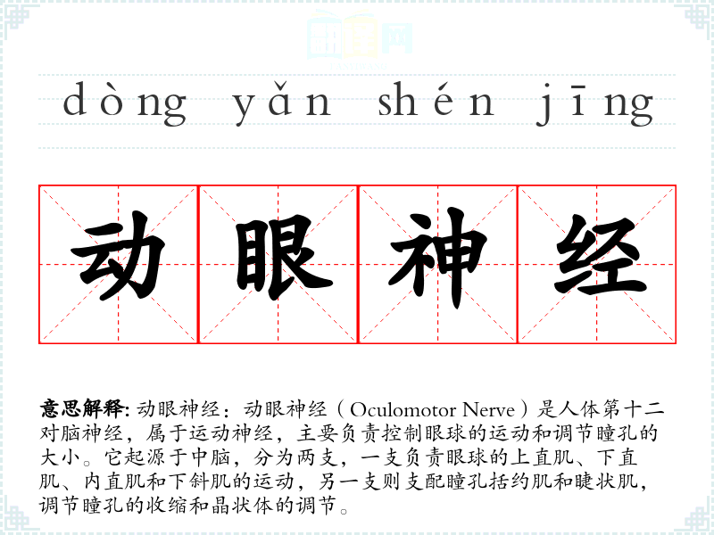 在医学专业领域,动眼神经是一个精确的解剖学术语,用于描述神经系统的特定部分。在日常口语或文学作品中,该词汇可能不会直接出现,但与之相关的症状或疾病(如动眼神经麻痹)可能会被提及,用以描述视觉障碍或眼球**异常。