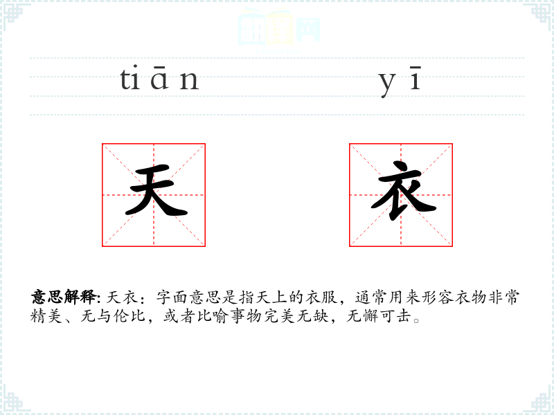 天衣:字面意思是指天上的衣服,通常用来形容衣物非常精美、无与伦比,或者比喻事物完美无缺,无懈可击。