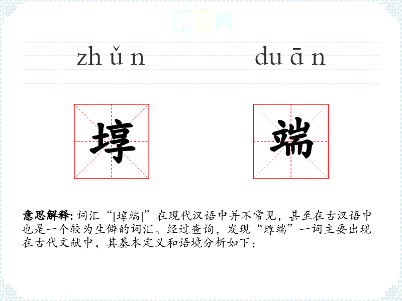 词汇“[埻端]”在现代汉语中并不常见,甚至在古汉语中也是一个较为生僻的词汇。经过查询,发现“埻端”一词主要出现在古代文献中,其基本定义和语境分析如下: