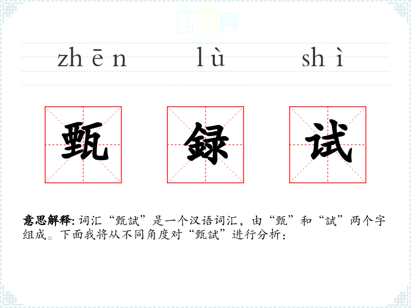- 字面意思:“甄”意为鉴别、选拔,“試”意为测试、试验。