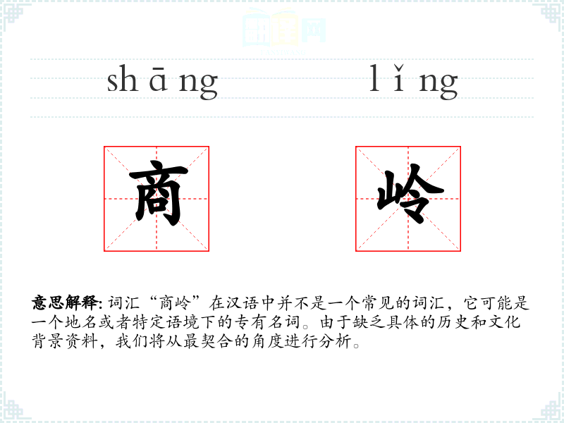 词汇“商岭”在汉语中并不是一个常见的词汇,它可能是一个地名或者特定语境下的专有名词。由于缺乏具体的历史和文化背景资料,我们将从最契合的角度进行分析。