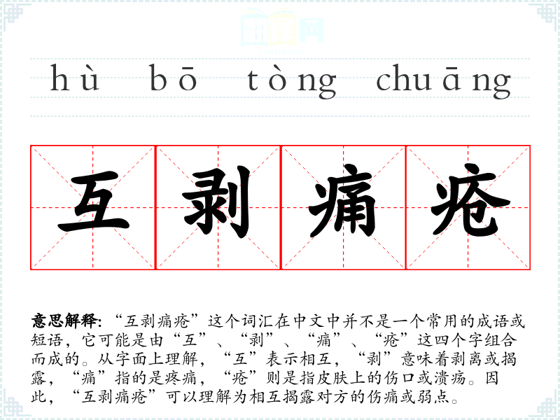 由于“互剥痛疮”不是一个标准的成语,它的词源和演变不太明确。它可能是由现代汉语中的常用词汇组合而成的,用于描述特定的情境或行为。