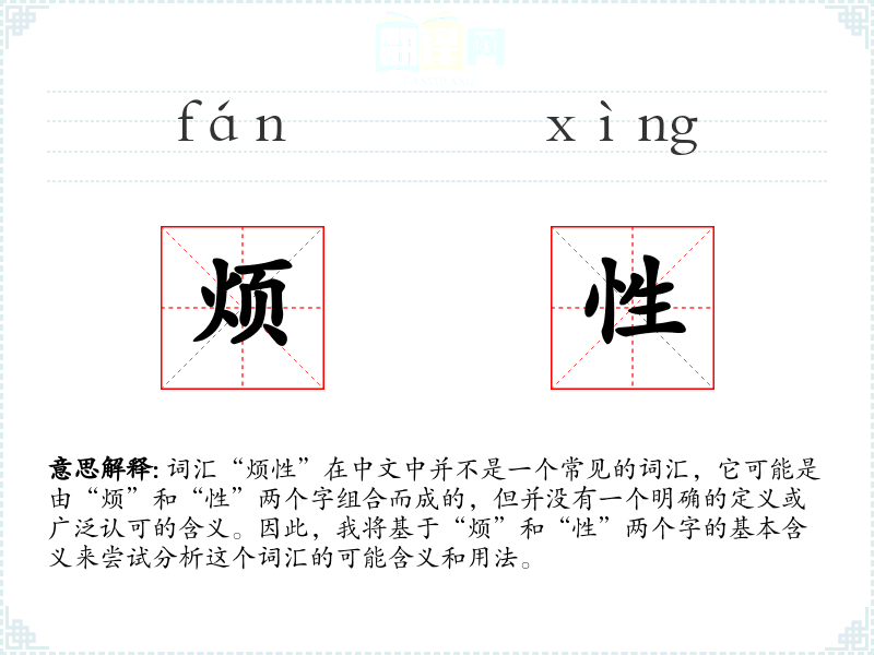由于“烦性”不是一个标准词汇,它在不同语境下的使用可能非常有限。在文学或口语中,如果出现这个词汇,可能是用来形容某人的性格特点,即容易烦躁或不耐烦。