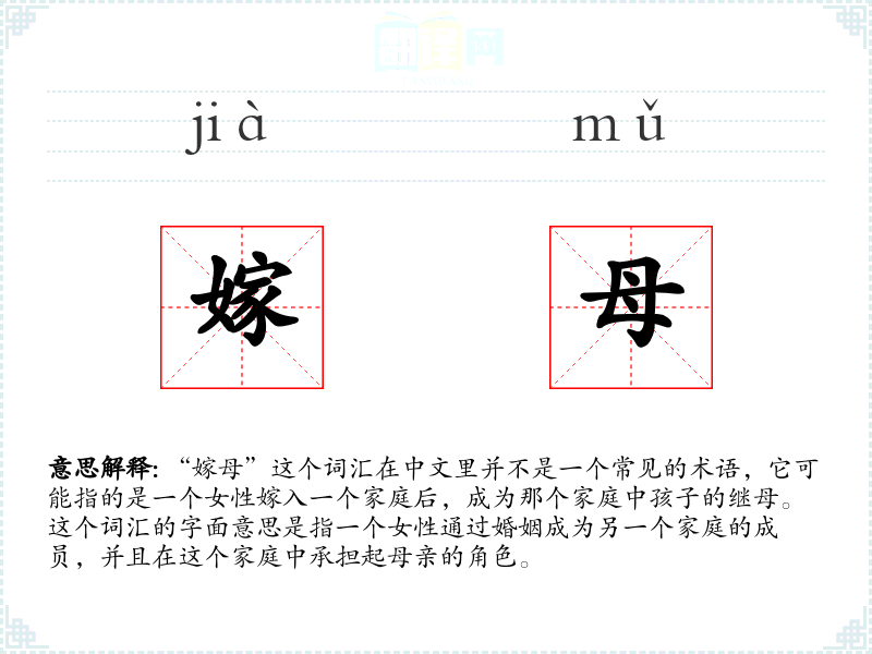 “嫁母”这个词汇在中文里并不是一个常见的术语,它可能指的是一个女性嫁入一个家庭后,成为那个家庭中孩子的继母。这个词汇的字面意思是指一个女性通过婚姻成为另一个家庭的成员,并且在这个家庭中承担起母亲的角色。