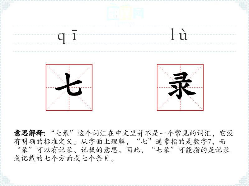 “七录”这个词汇不是一个常用词汇,它的意义和用法可能需要特定的语境或背景知识来理解。在语言学*和表达中,了解特定词汇的语境和背景是非常重要的。