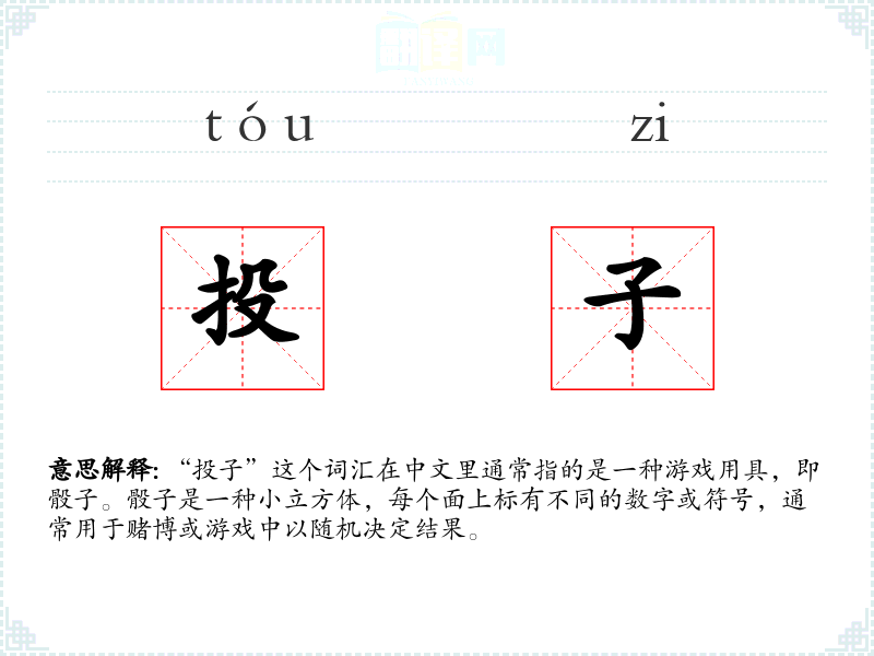 同义词:骰子、色子 反义词:(由于“投子”主要指一种具体物品,反义词不适用)