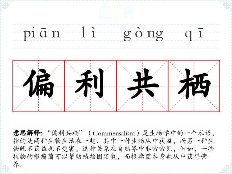 在不同语言中,“偏利共栖”可能有不同的表达方式,但其核心概念是相似的。例如,在德语中,这个概念可以被表达为“Kommensalismus”。