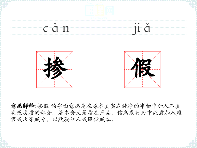 掺假 的字面意思是在原本真实或纯净的事物中加入不真实或劣质的部分。基本含义是指在产品、信息或行为中故意加入虚假或次等成分,以欺骗他人或降低成本。