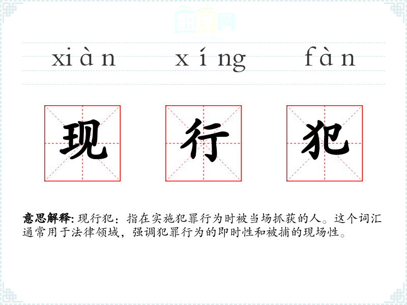 “现行犯”这个词汇在法律领域具有重要的意义,它强调了犯罪行为的即时性和现场性,有助于确保法律的公正执行。在学习法律和理解社会正义时,这个词汇是一个关键的概念。