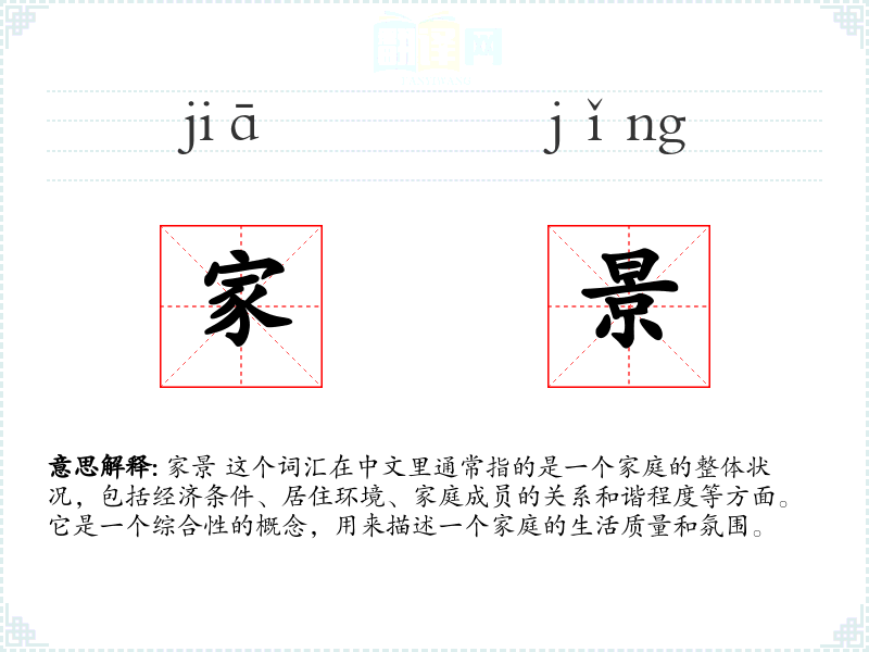 “家景”是一个多维度的词汇,它不仅描述了家庭的经济和物质条件,还包含了家庭成员间的情感联系和精神状态。在语言学*和表达中,理解和运用这个词汇可以帮助我们更全面地理解和描述家庭生活。