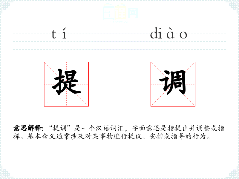 “提调”是一个汉语词汇,字面意思是指提出并调整或指挥。基本含义通常涉及对某事物进行提议、安排或指导的行为。