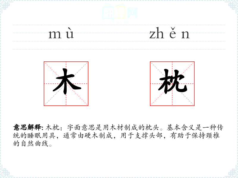 木枕:字面意思是用木材制成的枕头。基本含义是一种传统的睡眠用具,通常由硬木制成,用于支撑头部,有助于保持颈椎的自然曲线。