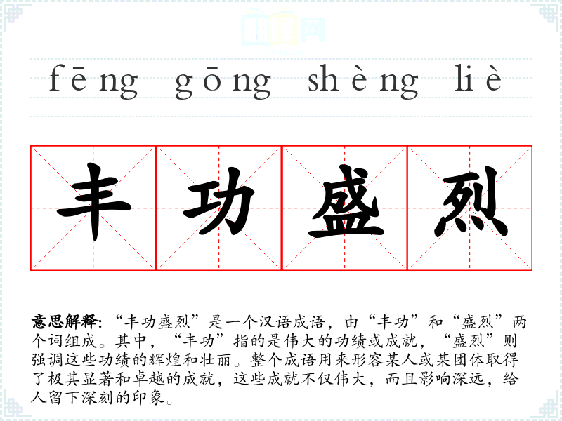 在文学作品中,“丰功盛烈”常用来赞颂历史上的英雄人物或重大,如描述一位将军在战场上的英勇表现,或一个国家在某个重要时期的繁荣发展。在口语中,这个成语可能不那么常用,但在正式的演讲或文章中,它仍然是一个有力的表达工具。在专业领域,如历史学、政治学等,这个成语也常被用来评价和分析历史或人物的贡献。