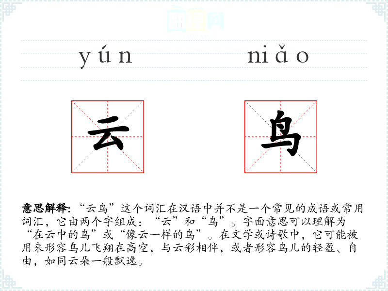 “云鸟”这个词汇在汉语中虽然不常见,但它提供了一个丰富的意象,可以用于文学创作和艺术表达中,传达自由、梦想和高远的志向。在语言学*和表达中,理解和运用这样的词汇可以丰富个人的语言库,提升表达的深度和美感。