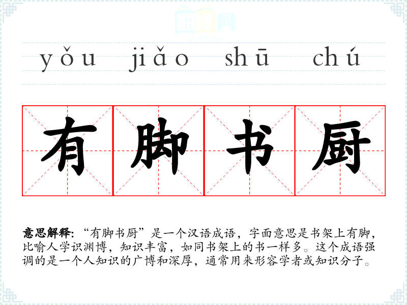 “有脚书厨”是一个汉语成语,字面意思是书架上有脚,比喻人学识渊博,知识丰富,如同书架上的书一样多。这个成语强调的是一个人知识的广博和深厚,通常用来形容学者或知识分子。