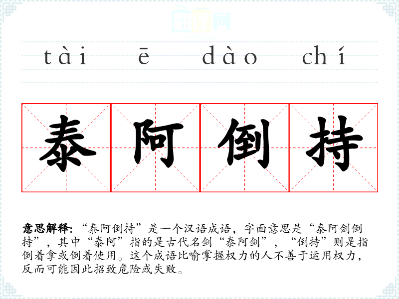 “泰阿倒持”是一个汉语成语,字面意思是“泰阿剑倒持”,其中“泰阿”指的是古代名剑“泰阿剑”,“倒持”则是指倒着拿或倒着使用。这个成语比喻掌握权力的人不善于运用权力,反而可能因此招致危险或失败。