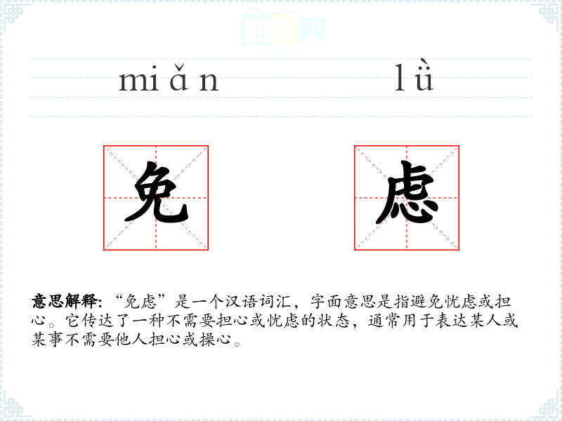 “免虑”是一个汉语词汇,字面意思是指避免忧虑或担心。它传达了一种不需要担心或忧虑的状态,通常用于表达某人或某事不需要他人担心或操心。