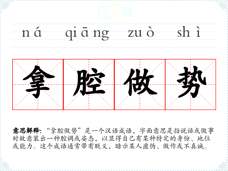 “拿腔做势”是一个汉语成语,字面意思是指说话或做事时故意装出一种腔调或姿态,以显得自己有某种特定的身份、地位或能力。这个成语通常带有贬义,暗示某人虚伪、做作或不真诚。
