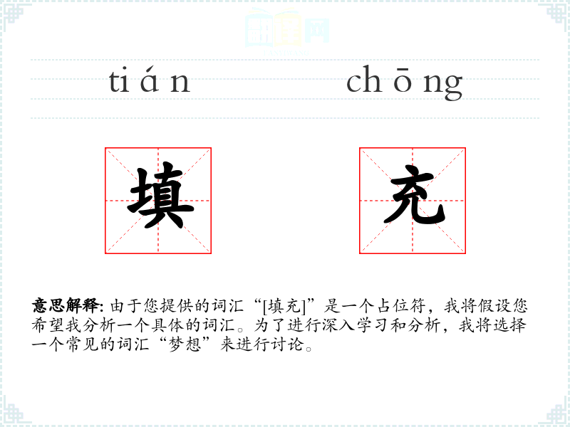 由于您提供的词汇“[填充]”是一个占位符,我将假设您希望我分析一个具体的词汇。为了进行深入学习和分析,我将选择一个常见的词汇“梦想”来进行讨论。