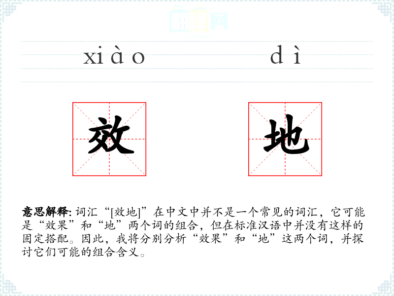 词汇“[效地]”在中文中并不是一个常见的词汇,它可能是“效果”和“地”两个词的组合,但在标准汉语中并没有这样的固定搭配。因此,我将分别分析“效果”和“地”这两个词,并探讨它们可能的组合含义。