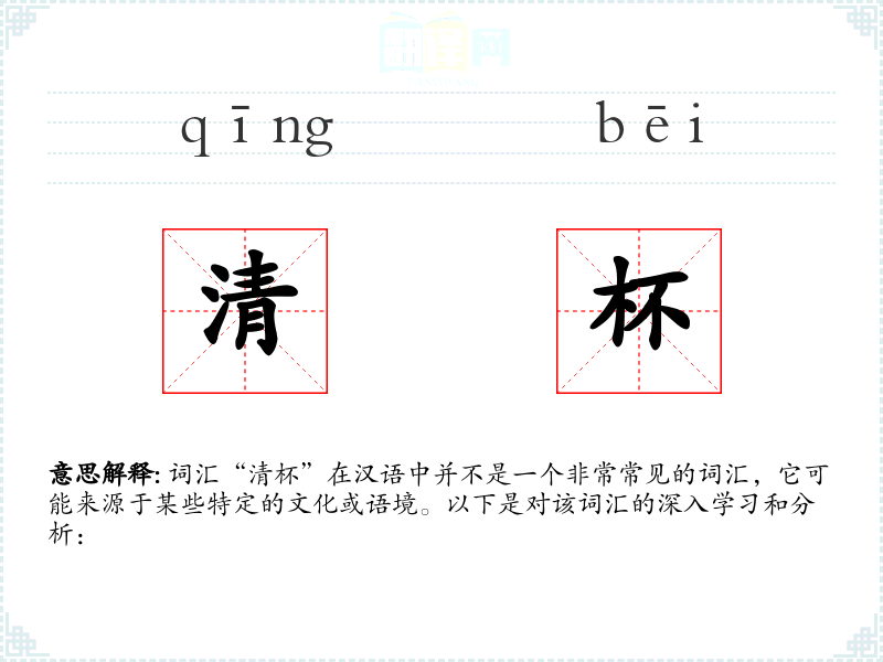 词汇“清杯”在汉语中并不是一个非常常见的词汇,它可能来源于某些特定的文化或语境。以下是对该词汇的深入学*和分析:
