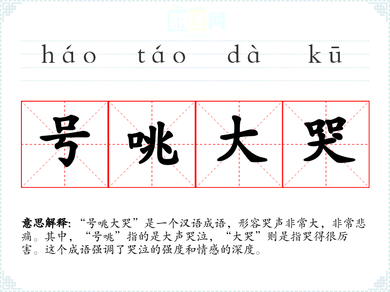 “号咷大哭”是一个汉语成语,形容哭声非常大,非常悲痛。其中,“号咷”指的是大声哭泣,“大哭”则是指哭得很厉害。这个成语强调了哭泣的强度和情感的深度。