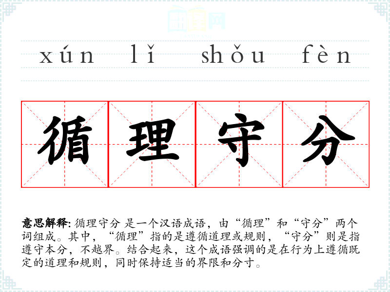 循理守分 是一个汉语成语,由“循理”和“守分”两个词组成。其中,“循理”指的是遵循道理或规则,“守分”则是指遵守本分,不越界。结合起来,这个成语强调的是在行为上遵循既定的道理和规则,同时保持适当的界限和分寸。
