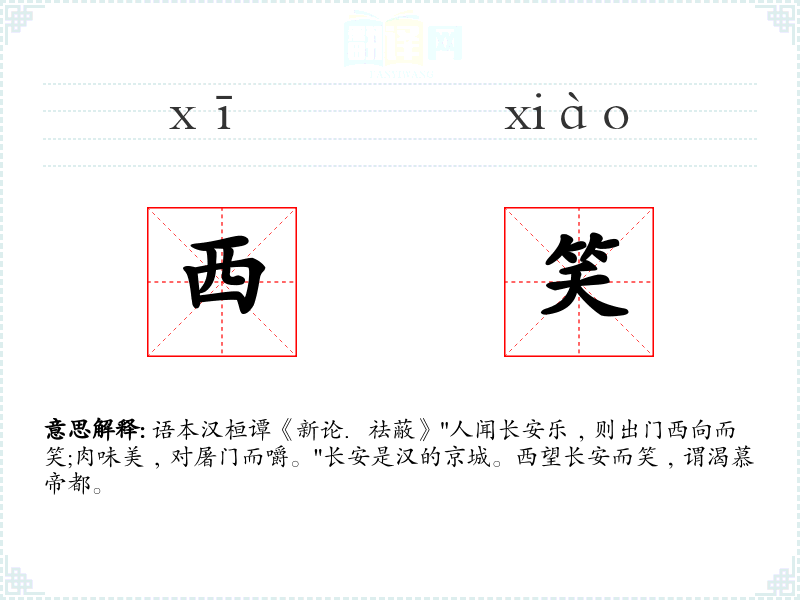 语本汉桓谭《新论.祛蔽》"人闻长安乐﹐则出门西向而笑;肉味美﹐对屠门而嚼。"长安是汉的京城。西望长安而笑﹐谓渴慕帝都。