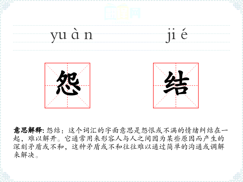 怨结:这个词汇的字面意思是怨恨或不满的情绪纠结在一起,难以解开。它通常用来形容人与人之间因为某些原因而产生的深刻矛盾或不和,这种矛盾或不和往往难以通过简单的沟通或调解来解决。
