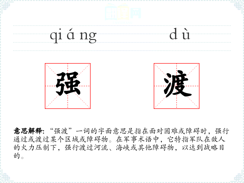 “强渡”一词的字面意思是指在面对困难或障碍时,强行通过或渡过某个区域或障碍物。在军事术语中,它特指军队在敌人的火力压制下,强行渡过河流、海峡或其他障碍物,以达到战略目的。