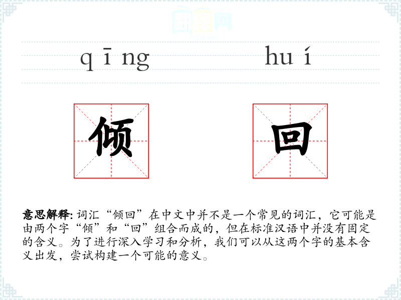 词汇“倾回”在中文中并不是一个常见的词汇,它可能是由两个字“倾”和“回”组合而成的,但在标准汉语中并没有固定的含义。为了进行深入学习和分析,我们可以从这两个字的基本含义出发,尝试构建一个可能的意义。
