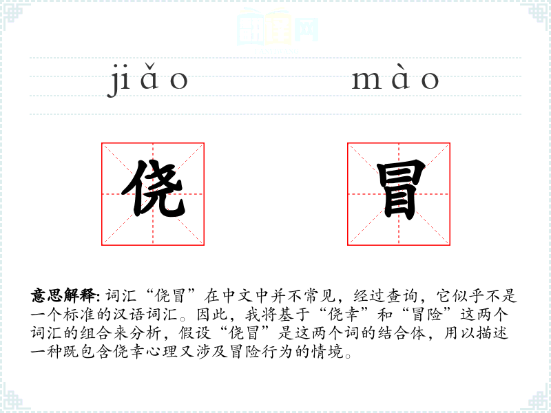 词汇“侥冒”在中文中并不常见,经过查询,它似乎不是一个标准的汉语词汇。因此,我将基于“侥幸”和“冒险”这两个词汇的组合来分析,假设“侥冒”是这两个词的结合体,用以描述一种既包含侥幸心理又涉及冒险行为的情境。
