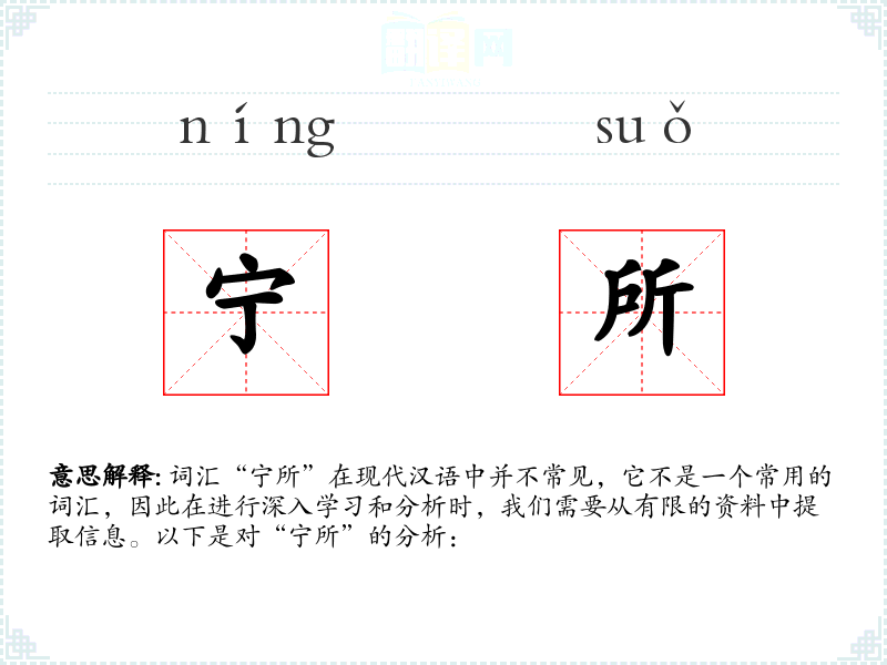 词汇“宁所”在现代汉语中并不常见,它不是一个常用的词汇,因此在进行深入学习和分析时,我们需要从有限的资料中提取信息。以下是对“宁所”的分析:
