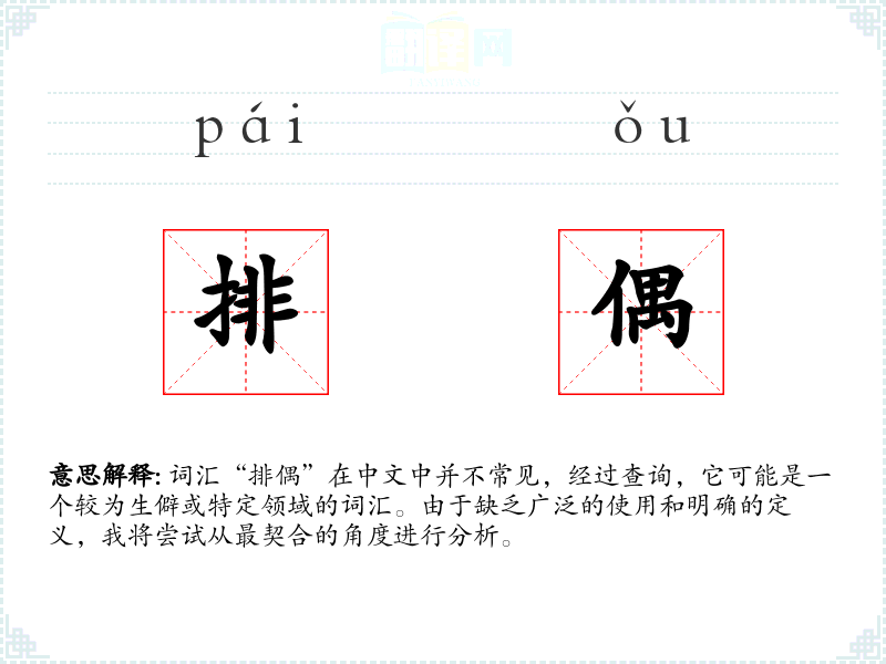 词汇“排偶”在中文中并不常见,经过查询,它可能是一个较为生僻或特定领域的词汇。由于缺乏广泛的使用和明确的定义,我将尝试从最契合的角度进行分析。
