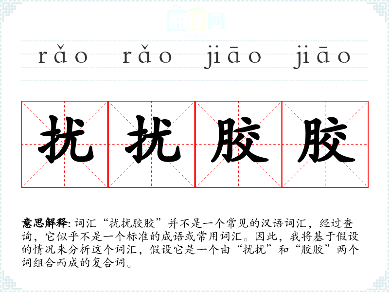 词汇“扰扰胶胶”并不是一个常见的汉语词汇,经过查询,它似乎不是一个标准的成语或常用词汇。因此,我将基于假设的情况来分析这个词汇,假设它是一个由“扰扰”和“胶胶”两个词组合而成的复合词。