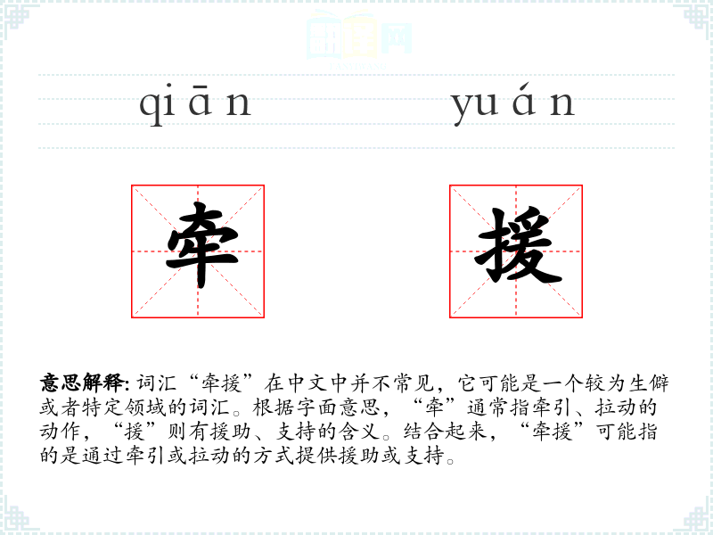 由于“牵援”不是一个常用词汇,其词源和演变可能不太明确。通常,“牵”和“援”都是较为古老的词汇,分别有牵引和支持的含义。