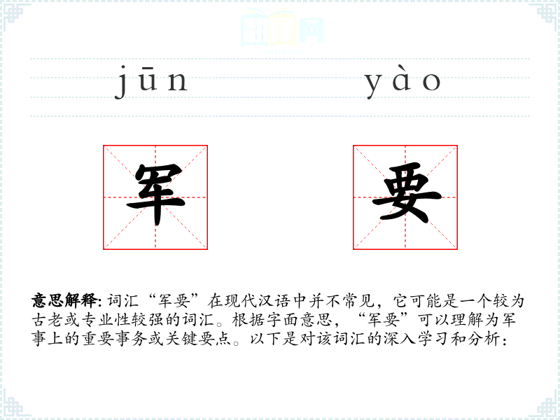 “军要”是一个具有特定历史和文化背景的词汇,虽然在现代汉语中不常见,但在学和理解军事历史和战略时,它仍然具有一定的价值。通过深入学这个词汇,可以更好地把握军事领域的专业术语和文化内涵。