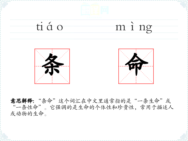- 反义词:无(因为“条命”本身是描述存在的,没有直接的反义词)