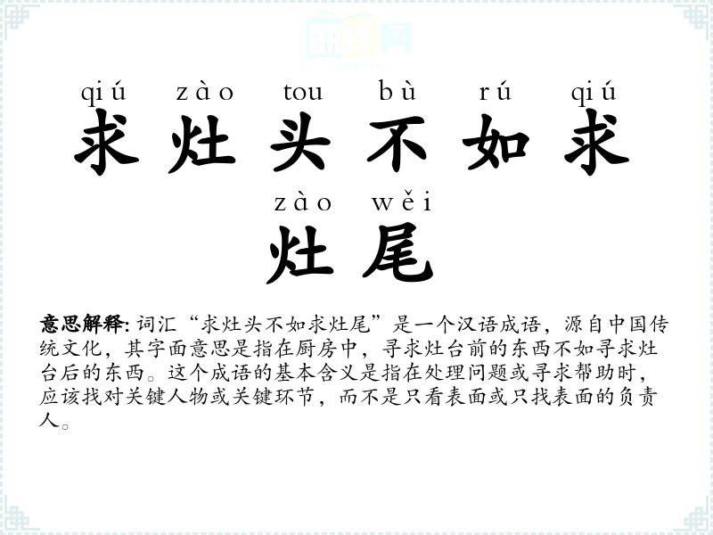 词汇“求灶头不如求灶尾”是一个汉语成语,源自**传统文化,其字面意思是指在厨房中,寻求灶台前的东西不如寻求灶台后的东西。这个成语的基本含义是指在处理问题或寻求帮助时,应该找对关键人物或关键环节,而不是只看表面或只找表面的负责人。