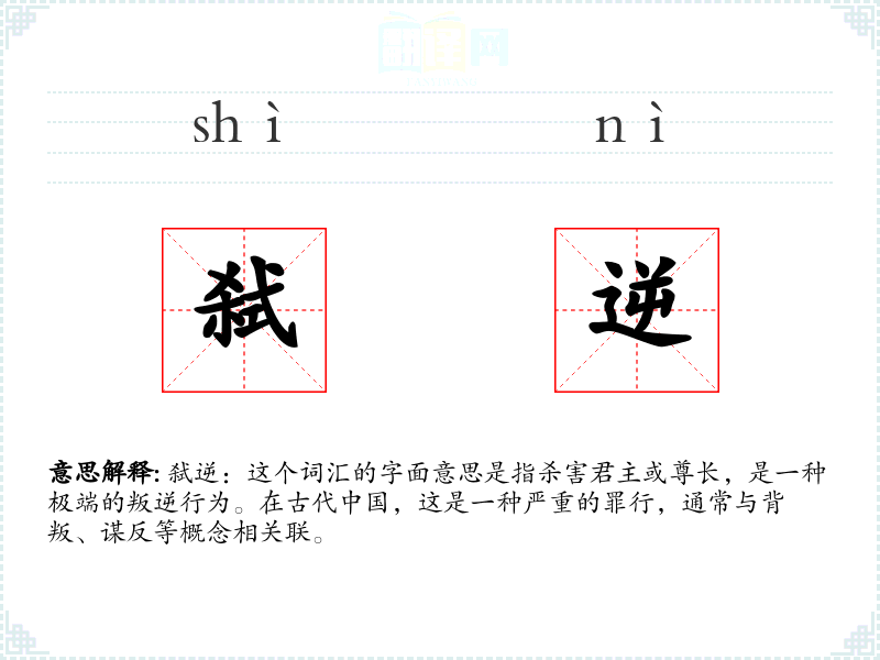 弑逆:这个词汇的字面意思是指杀害君主或尊长,是一种极端的叛逆行为。在古代**,这是一种严重的罪行,通常与背叛、谋反等概念相关联。