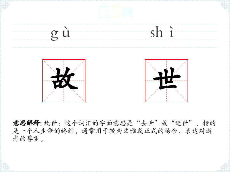 故世:这个词汇的字面意思是“去世”或“逝世”,指的是一个人生命的终结,通常用于较为文雅或正式的场合,表达对逝者的尊重。